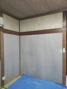 既存の壁は京壁塗りですので、薄い合板を張り被せてから壁紙を貼ります。